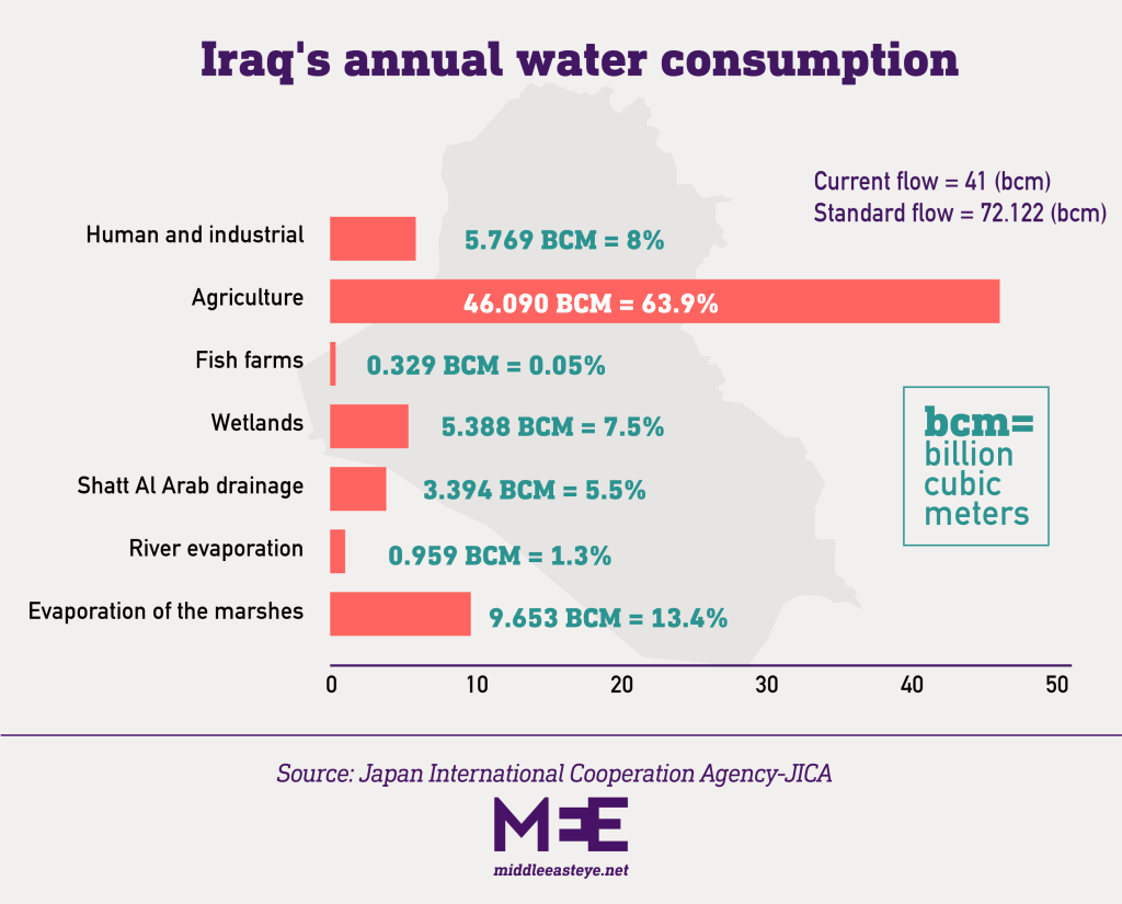 Iraq uses more than 63 percent of its water resources on agriculture, even when it often relies on imported food. According to the head of Iraq’s parliamentary agriculture and water committee, Salam al-Shammari: “Farming techniques in Iraq are rudimentary; therefore, we have a significant waste of water with a weak agricultural output.”