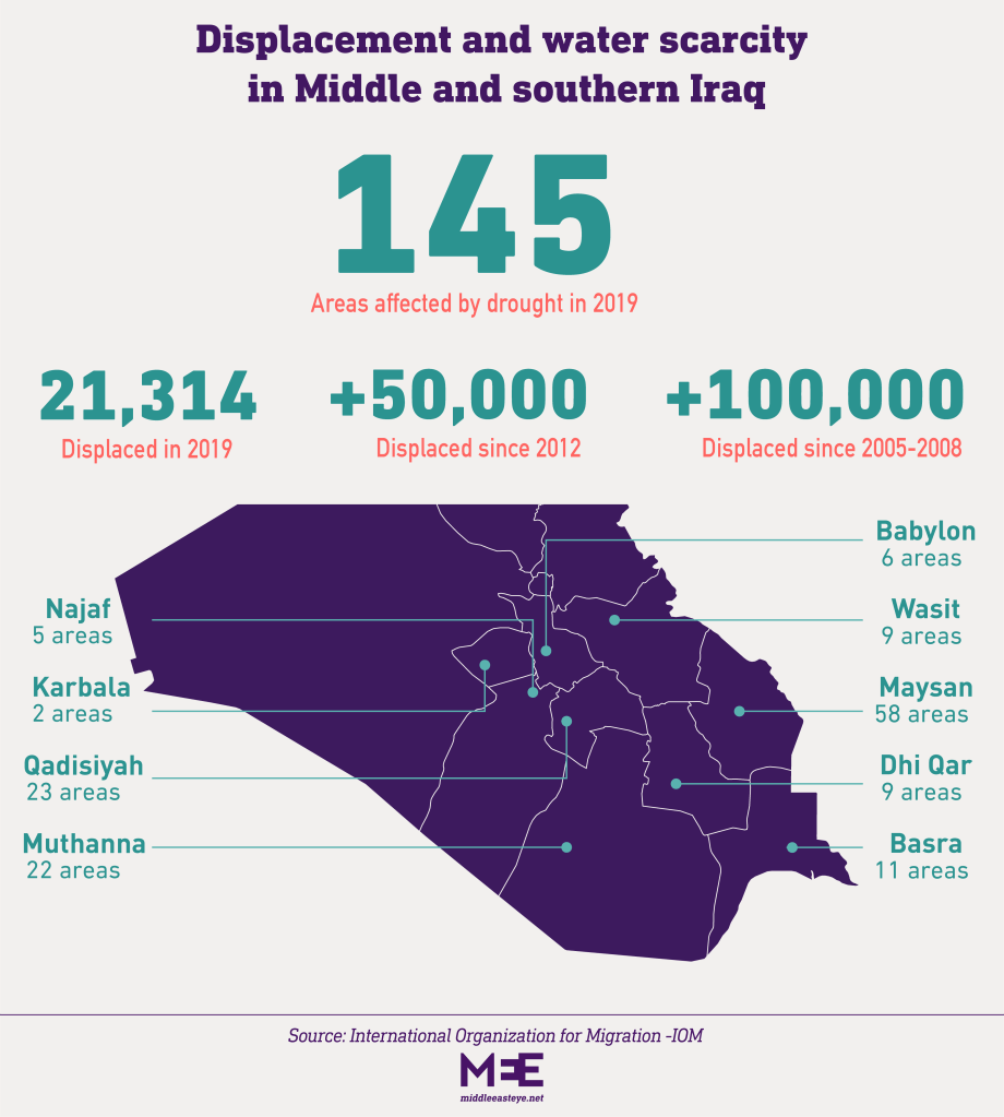 At the same time, the International Organization for Migration found in 2019 that 21,314 people from Iraq’s central and southern governorates had been displaced due to water scarcity, high salinity content in the water, or waterborne diseases. Several years earlier, in 2012, 20,000 people were displaced from agricultural communities due to drought. Families who have inhabited villages for decades are being forced to leave their ancestral lands.