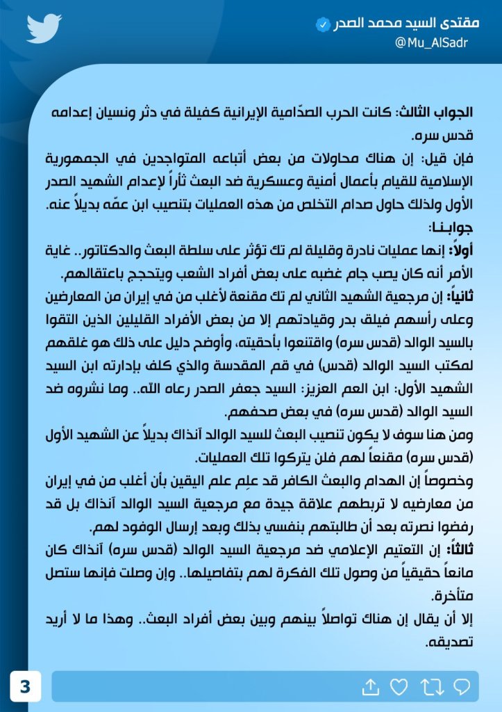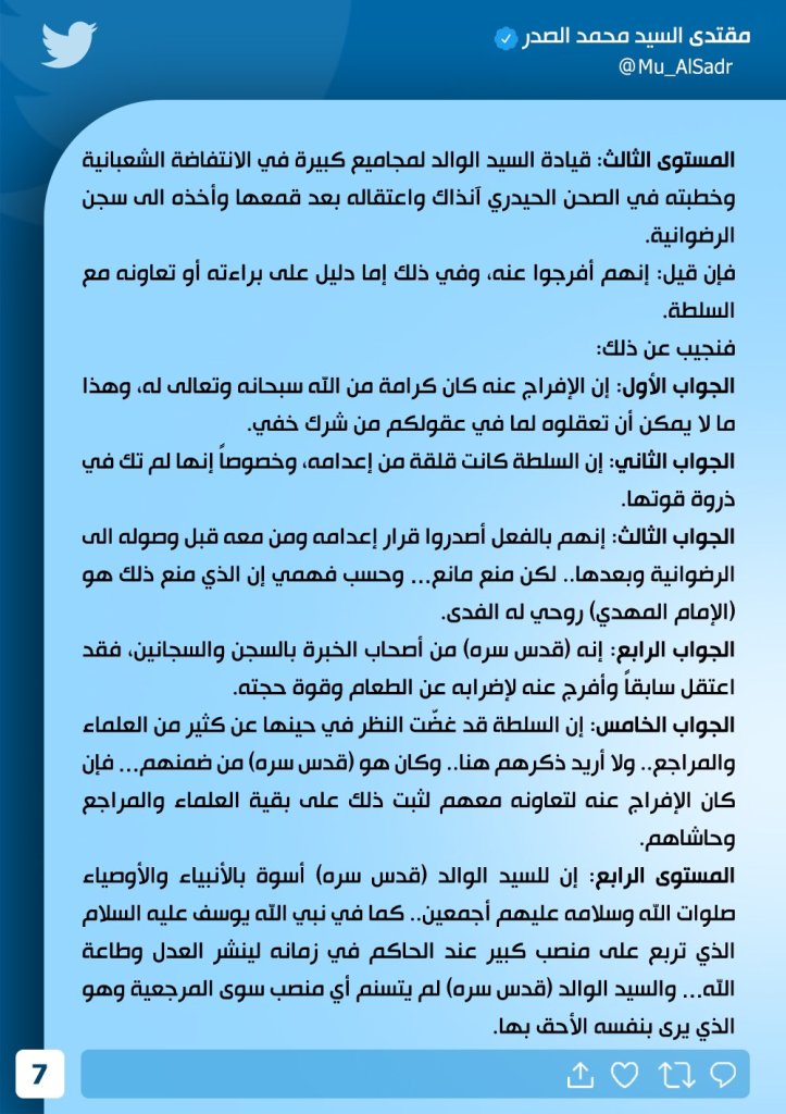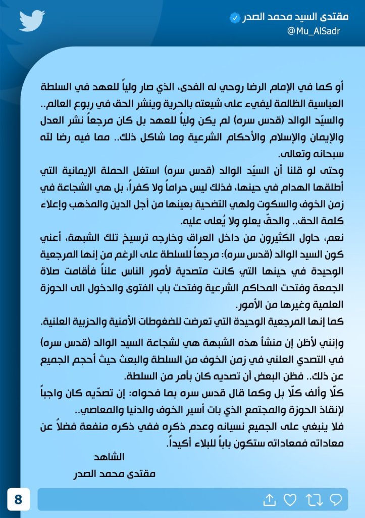 تغريدة مطولة للصَّدر على حسابه الموثق (مقتدى السيد محمد الصَّدر) على تويتر، نشرت في 20 حزيران/ يونيو 2023.