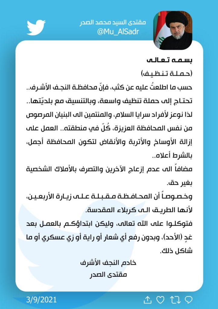 - الصدر يدعو إلى حملة تنظيف “واسعة” في النجف، روداوو عربية، 3 أيلول/ سبتمبر 2021. ↩︎