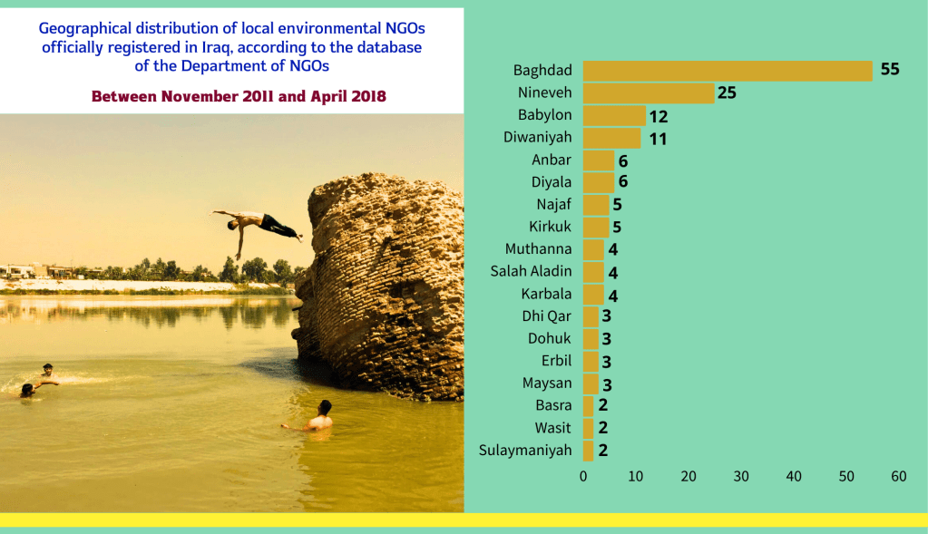 The escalating climate change challenges, including water scarcity and desertification particularly exacerbated by the drought that affected Iraq in 2008, highlighted the necessity for the establishment of new environmental entities.12 This need arose within the limited space available for civil society representation in accordance with the national legislative framework governing NGOs in 2010, which contributed to improved governance of these organizations. However, environmental NGOs in Iraq have generally exhibited two contrasting features: a sluggish response to local environmental challenges and unstable funding opportunities that depend on donor interest in addressing critical issues.