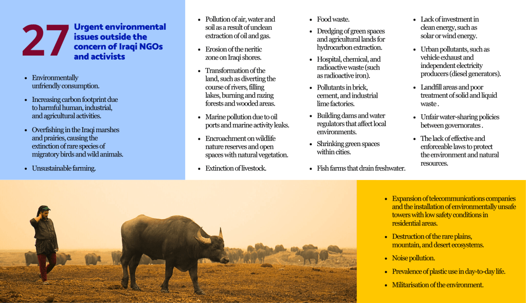 Water scarcity37 is a prominent environmental concern in Iraq, especially within networks focusing on protecting the public’s right to access renewable resources amidst recurring droughts since 2008. This issue poses a threat to the historic water network of Mesopotamia and disrupts economic activities in the Tigris and Euphrates basins, which are vital for stability and civil peace. However, this study highlights 27 other urgent environmental issues that receive limited attention from NGOs and actors due to inadequate funding or potential conflicts with the state or some communal practices.