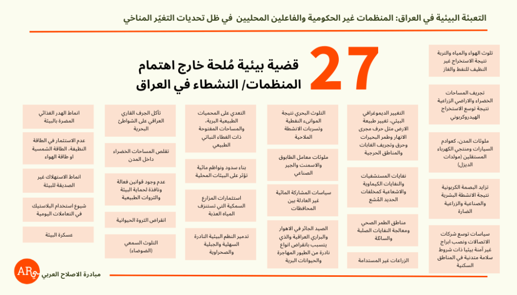 تُشكل نُدرة المياه،36 الإطار الأوسع للنقاشات والمبادرات البيئية التي تستهدف حماية الحق العام في الوصول إلى مصادر متجددة في ظل موجات الجفاف المتعاقبة منذ 2008 على الأقل، لما تمثله من تهديد لشبكة المياه التاريخية لبلاد ما بين النهرين، وتدمير أنماط اقتصادية مرتبطة ببنية المجتمعات التقليدية الريفية أو المدينية في الحوض الوطني لدجلة والفرات، التي ضمنت استقراراً وسلماً أهلياً. لكن هذه الدراسة، أشّرت إلى 27 قضية بيئية مُلحة مُجاورة لندرة المياه، لا تلقى تركيزاً من المنظمات أو الفاعلين البيئيين، لأنها لا تحظى بالتمويل الكافي، أو تتسبب بحالة تعارض مع الدولة/ حُزم السلطة، أو المجتمع الأهلي نفسه الذي يغرق في ممارسات وأنشطة غير صديقة بيئياً.