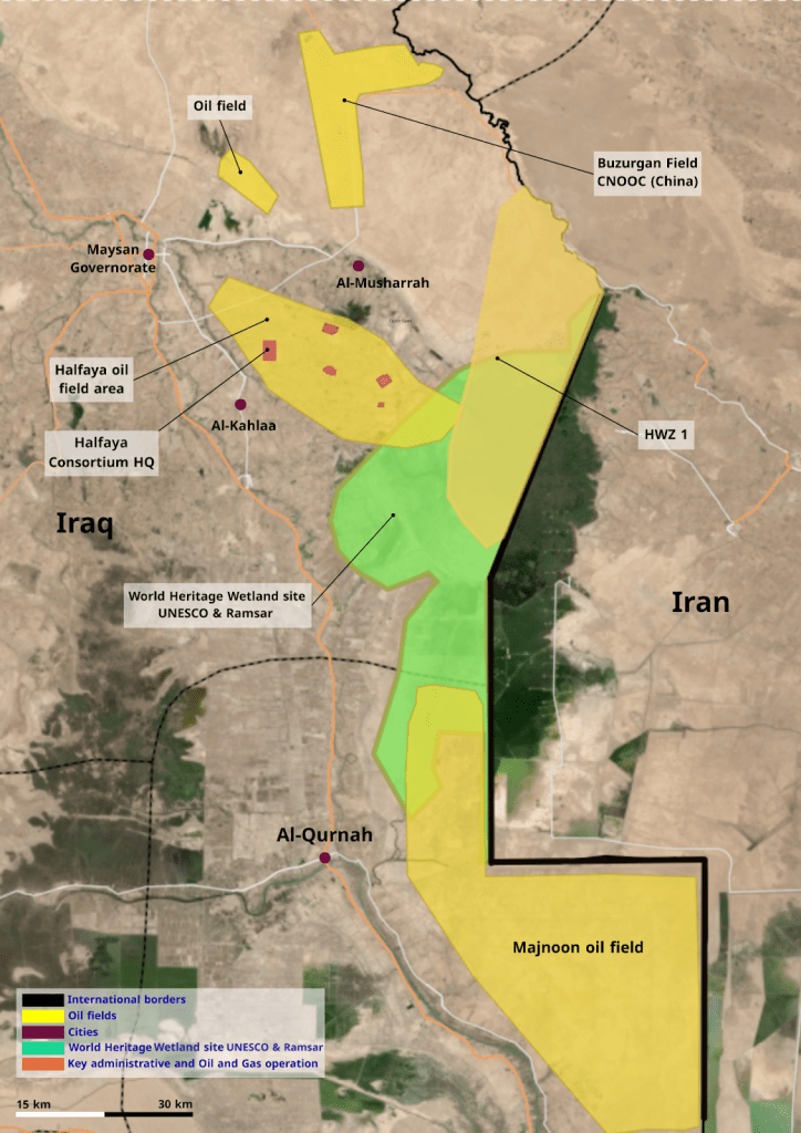 تُعدّ رخصة الامتياز النفطي الجديدة الممنوحة للشركة الصينية إشكالية إلى حدٍّ بالغ. إذ يقع حقل «حويزة 1» بين حقل الحلفاية شمالاً وحقل مجنون جنوباً، أي بين الجزأين الشمالي والجنوبي من هور الحويزة، في قلب المنطقة المحمية المُدرجة ضمن اليونسكو واتفاقية رامسار. تُظهر ملاحظات مديرية بيئة ميسان أن التداخل بين منطقة الاستخراج والمنطقة المحمية في هور الحويزة يمتد على مساحة تُقدَّر بنحو 300 كيلومتر مربع. ويبلغ طول الحقل نحو 17 كيلومتراُ، وعرضه قرابة 8 كيلومترات، فيما تُقدَّر احتياطياته بحوالي 2.4 مليار برميل.